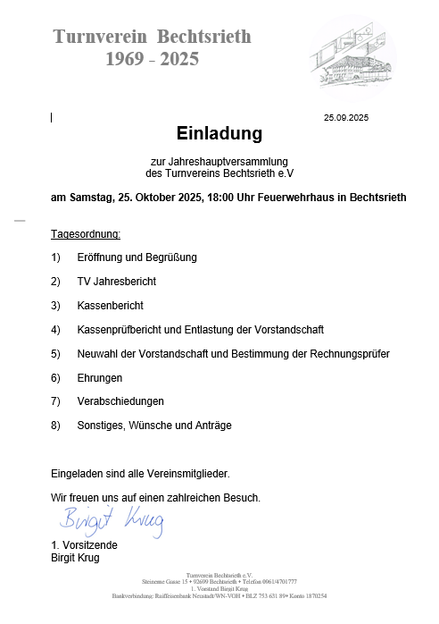 Auf diesen Seiten finden Sie Informationen über unseren Verein und unsere Aktivitäten. Der Turnverein Bechtsrieth ist mehr als nur ein Name. Er ist die sportliche Heimat von mehr als 500 Mitgliedern. Bei uns können Kinder, Jugendliche, Frauen und Männer ihre persönliche Sportart ausüben - allein, zu zweit oder mit der ganzen Familie.